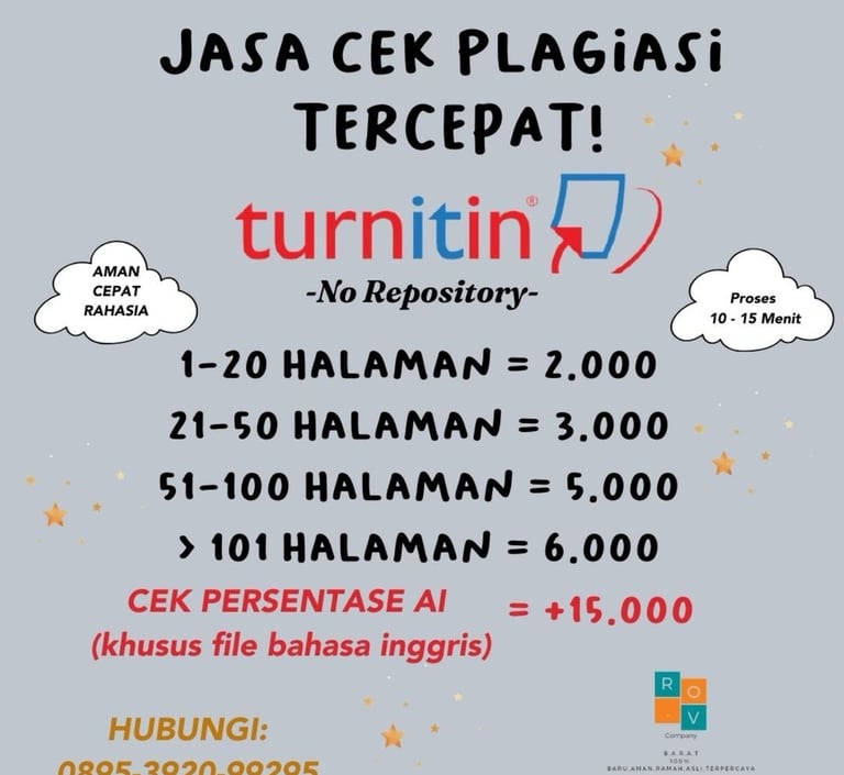 Layanan cek plagiasi Turnitin dan parafrase manual murni tanpa trick yang sudah membantu lebih dari 10.000 mahasiswa.
